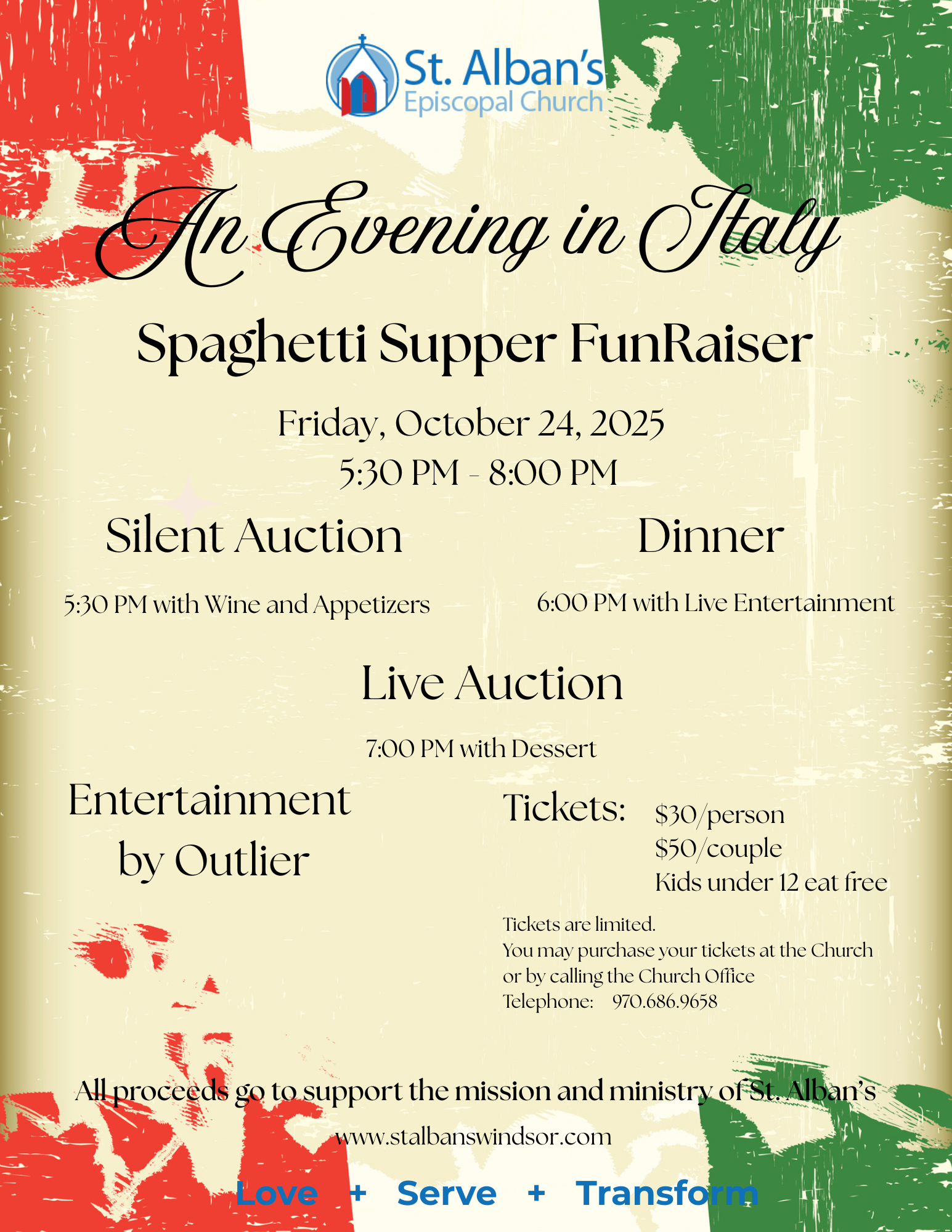 Join us Friday, October 24 at 5:30 PM for an evening of food and fun at our Evening in Italy Spaghetti Supper FunRaiser … Dinner, Silent Auction, Live Auction, and Entertainment by Outlier! Tickets are $30/person; $50/couple; kids under 12 eat free (but still need a ticket). Seating is limited so get your tickets now!